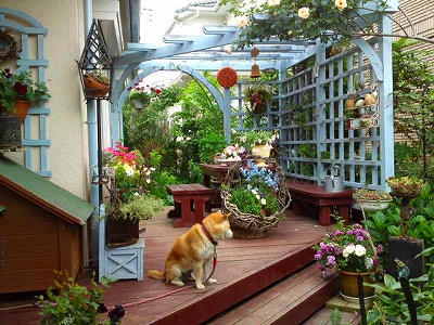 ワンコが出迎えてくれました。デッキの周りにバラがたくさん、蕾もたくさん