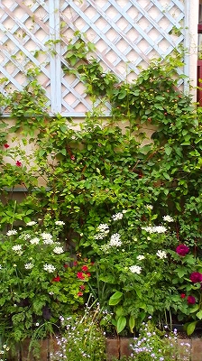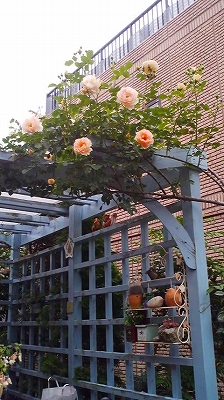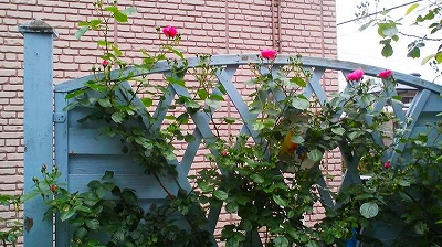 裏庭からデッキに戻る時、ご自宅の壁にもバラを這わせていました。
